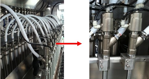 4、氣缸帶動(dòng)灌裝頭運(yùn)行的下潛灌裝方式,配合可設(shè)定的變速灌裝功能,可降低易起泡物料在灌裝時(shí)泡沫的產(chǎn)生,防止物料外溢造成的瓶口污染。同時(shí)將灌裝頭下潛的氣缸動(dòng)作機(jī)構(gòu)移到積液水盤的下方,防止外濺物料對(duì)氣缸等零件的腐蝕,目前只有我公司采用這種專li機(jī)構(gòu)。