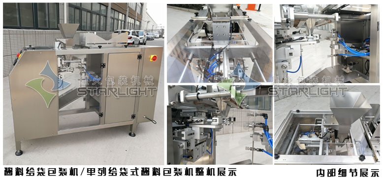 醬料給袋包裝機(jī)/單列給袋式醬料包裝機(jī)是星火公司專門針對自立袋醬料包裝所設(shè)計(jì)的一款新型給袋包裝機(jī),采用全不銹鋼材質(zhì)制作,干凈衛(wèi)生,清潔方便,與物料接觸部件采用優(yōu)質(zhì)316L不銹鋼制作,符合食品加工機(jī)械的衛(wèi)生標(biāo)準(zhǔn),保證食品的衛(wèi)生和安全,PLC控制器,大屏顯示,操作簡單易學(xué),通過不同的計(jì)量器,可以適用于液體、醬體、顆粒、粉末、不規(guī)則塊狀物等物料的包裝,于多層復(fù)合膜、單層PE、PP等材料制成的預(yù)制袋、紙袋均可應(yīng)用。