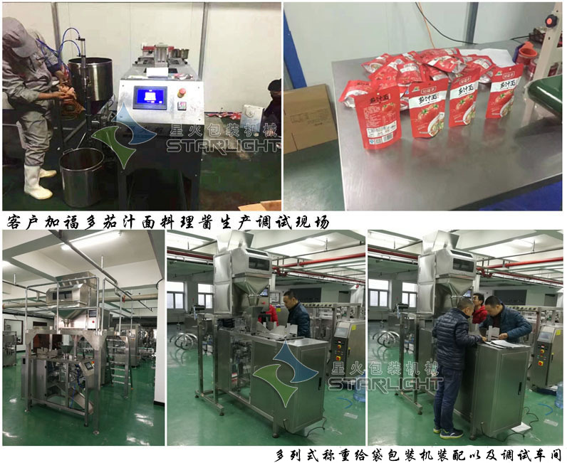 該機(jī)適用范圍廣泛,可采用多種計(jì)量方式,上圖中分別采用了顆粒醬料灌裝機(jī)、和多列組合稱等搭配試用,效率高,大大的節(jié)省企業(yè)的生產(chǎn)成本,提高企業(yè)效益。