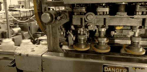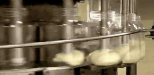 旋轉(zhuǎn)多頭灌裝機(jī):底下的流水線走塑料罐,上面灌蛋黃醬,0.25 秒就能裝滿一個(gè) 600 毫升的大罐子,再看這么多的灌裝頭,可見生產(chǎn)速度和產(chǎn)量非常驚人。